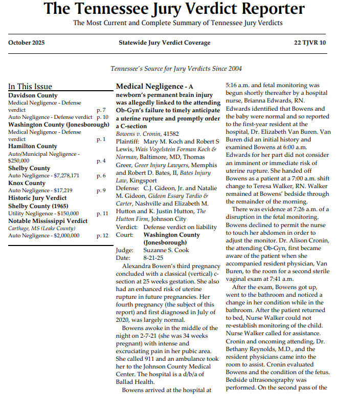 Here are some recent (and not so recent) sample editions of the Tennessee Jury Verdict Reporter (PDF):