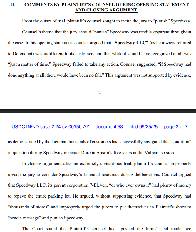 In the underlying case the plaintiff tripped at a Speedway gas station in Valparaiso on a defect in the parking lot. He suffered a broken jaw. The case was tried to a federal jury in Hammond on 8-27-25. The plaintiff took $1,000,000 less 50% comparative fault. See 26 IJVR 9 for the original verdict report. We also discussed the verdict in a blog post on 9-3-25.