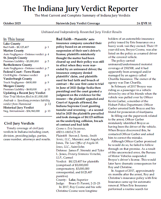 The October 2025 edition is out and features several interesting verdicts with a heavy lean into premises with a $3,000,000 result from St. Joseph County and a $600,000 Morgan County result. It leads off though with the $8.125 million bad faith case from Lake County