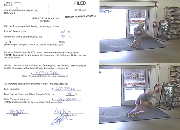 The jury (on Tuesday after a two-day trial) was mixed on fault assessing 90% to Ollie's Bargain Outlet and 10% to the plaintiff. The damages were $600,000 resulting in net verdict of $540,000.