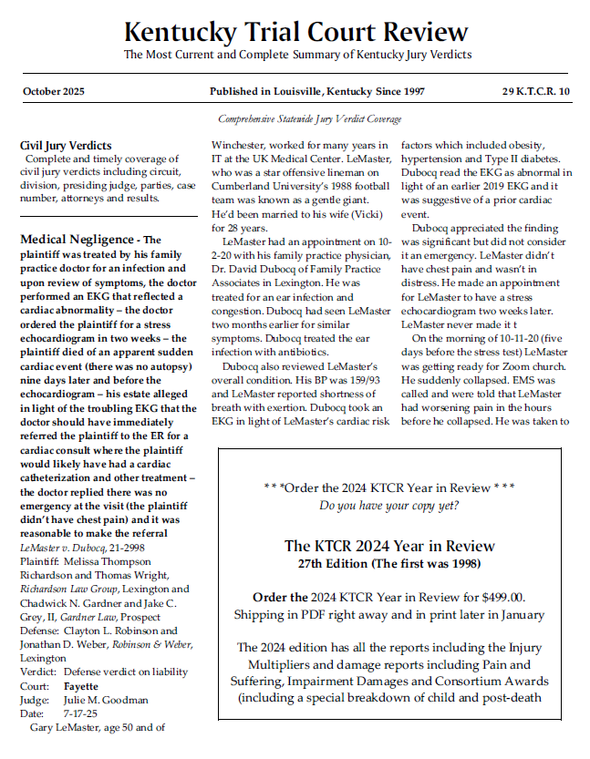 We have a quick preview of the October edition (29 KTCR 10) which will be out early next week. It features an interesting med mal result, and notably, the plaintiffs have moved to recuse the trial judge (Goodman) for bias during the trial. See the October issue for all the details.
