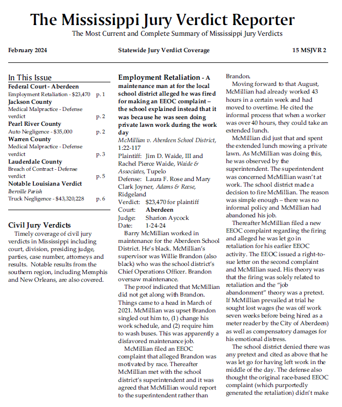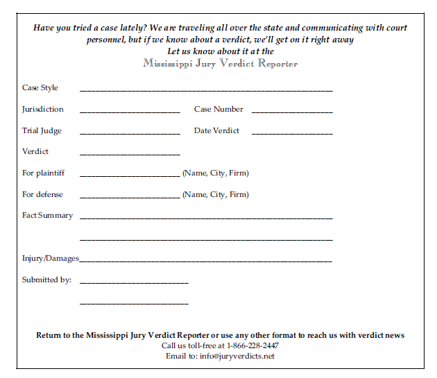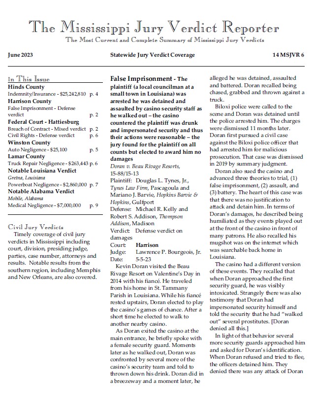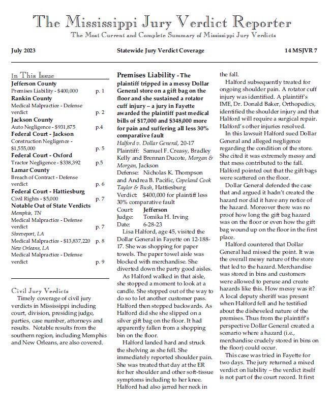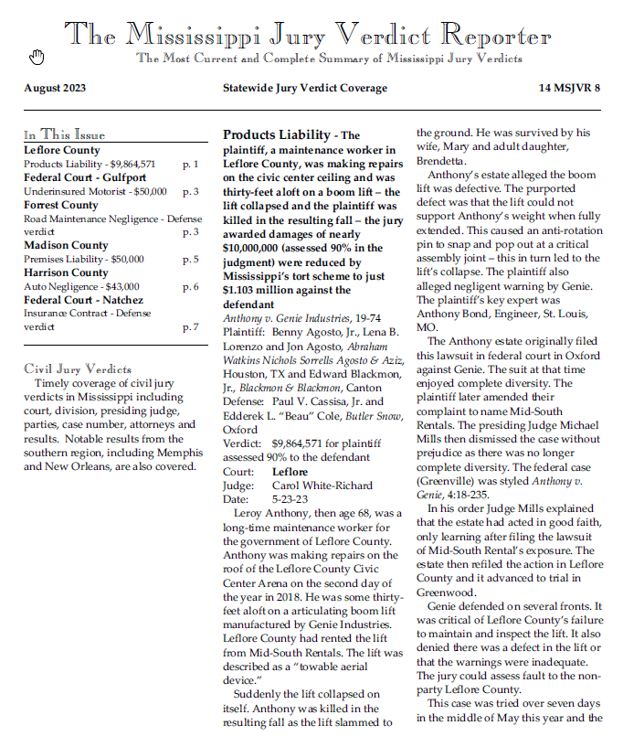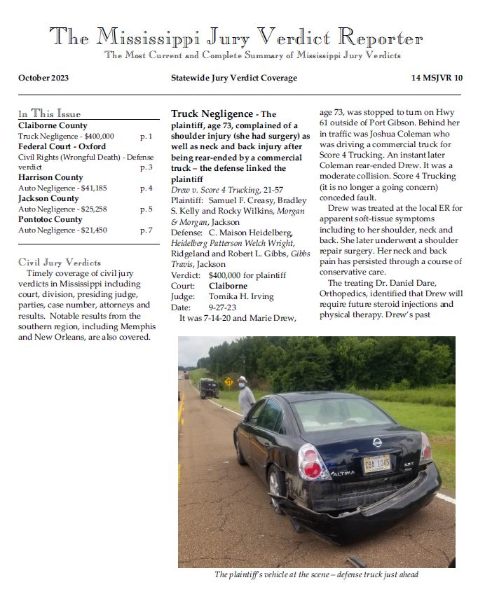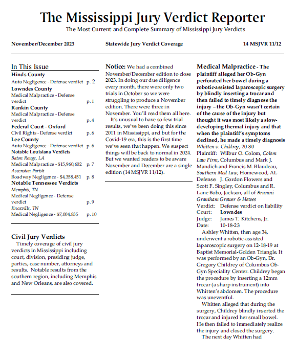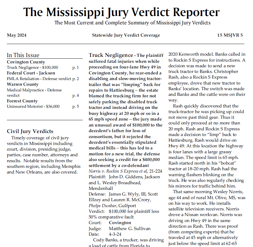 Subscribe to the Mississippi Jury Verdict Reporter -- report coming in the May 2024 edition