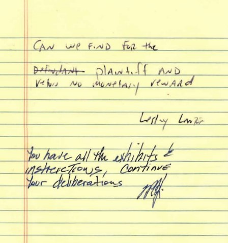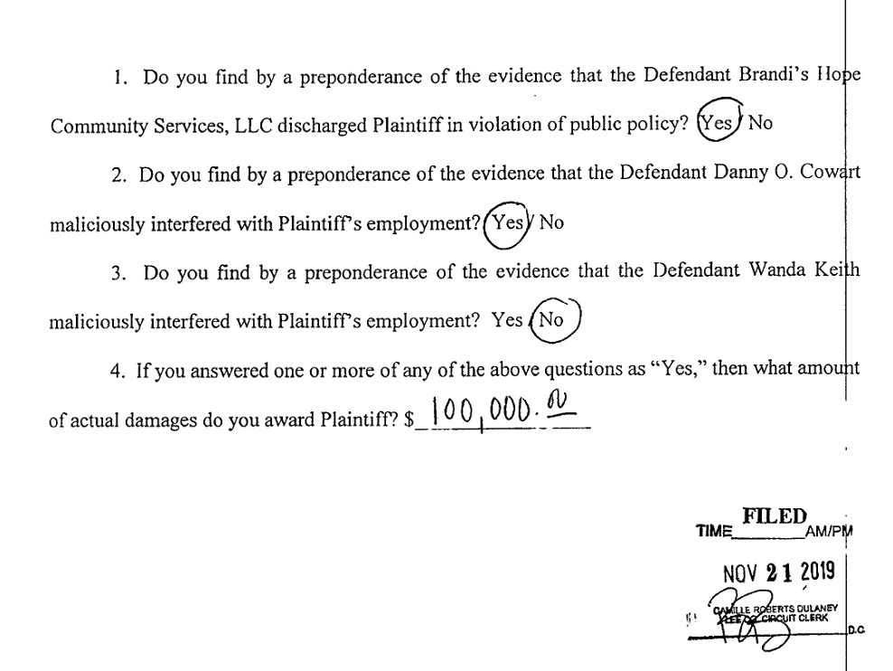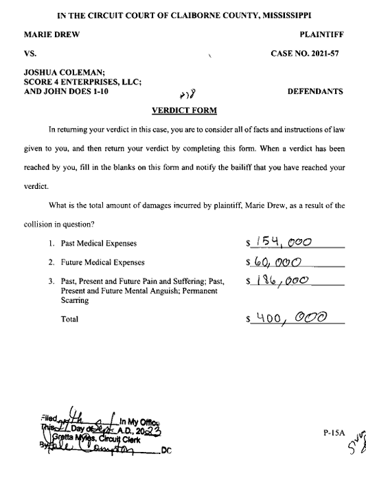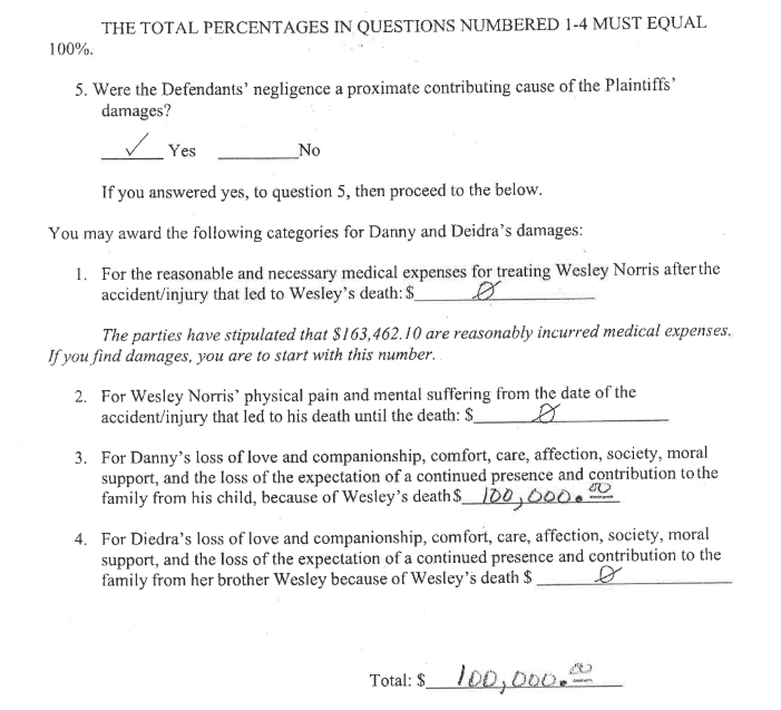 A jury in Harrison County returned a general verdict (handwritten) for the plaintiff in the sum of $100,000. While a significant verdict, it was slightly less than her claimed special damages.
