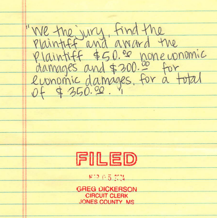 On 3-5-24 a jury in Laurel awarded the plaintiff economic damages of $300 (the incurred medicals were $12,000 and she sought $43,000 for future care) and just fifty bucks ($50.00) for non-economic damages. The verdict totaled $350.00.