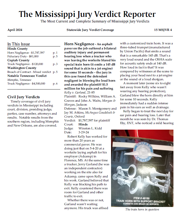The April issue (15 MsJVR 4) is almost finished-- features a $1.7 million verdict in an unusual train horn auditory injury case