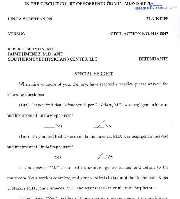The Forrest County trial involved an ophthalmologic care -- the plaintiff was left blind in her left eye after a cataract surgery