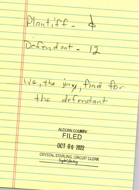 The case was tried for four days in Cornith. The jury deliberated 30 minutes on 10-6-22 and returned a defense verdict.