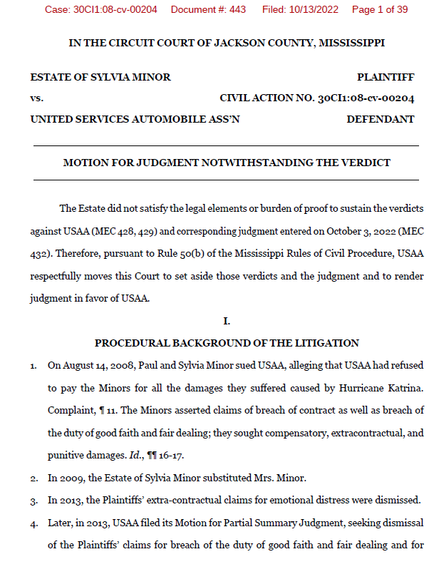 Just after the October 2022 issue was published (13 MsJVR 10), we learned new post-trial motions were filed in Minor v. USAA from Jackson Circuit Court. on 9-23-22 a Pascagoula jury awarded the plaintiff $10,457,858 in damages regarding a Hurricane Katrina bad faith claim. That included punitive damages of $10,000,000.