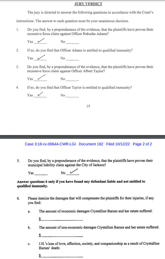The verdict is in (yesterday) the fatal shooting case of Crystalline Barnes on 1-27-18 in Jackson. Two officers fired 23 shots. 19 hit the plaintiff's car. 2 hit the plaintiff. 2 more hit a nearby house on this residential street.