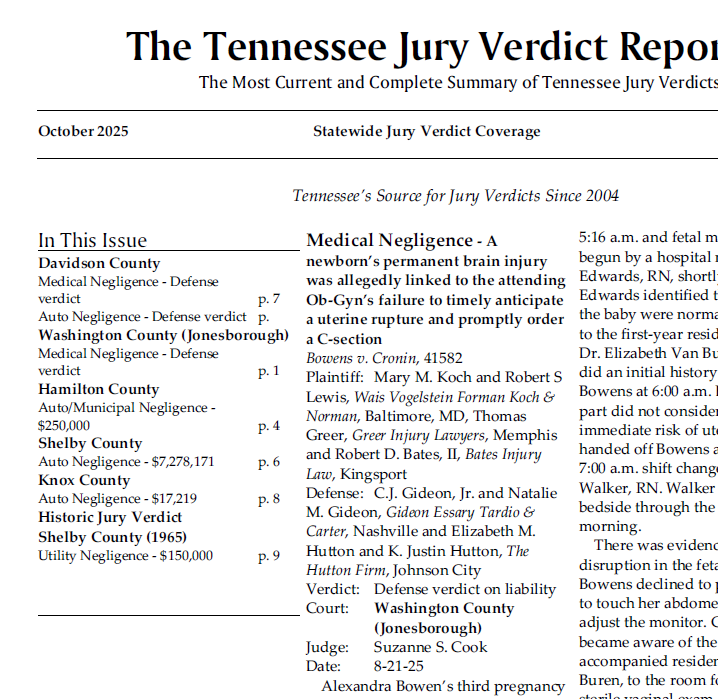 Subscribe to the Tennessee Jury Verdict Reporter for all the details.