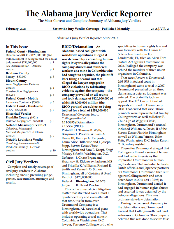 Here are some recent sample editions of the Alabama Jury Verdict Reporter (PDF)
