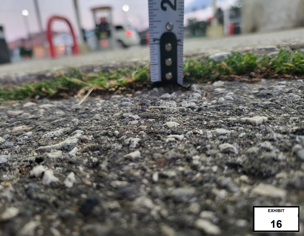 An exhibit from trial of the purported parking lot defect where the asphalt met the cement.