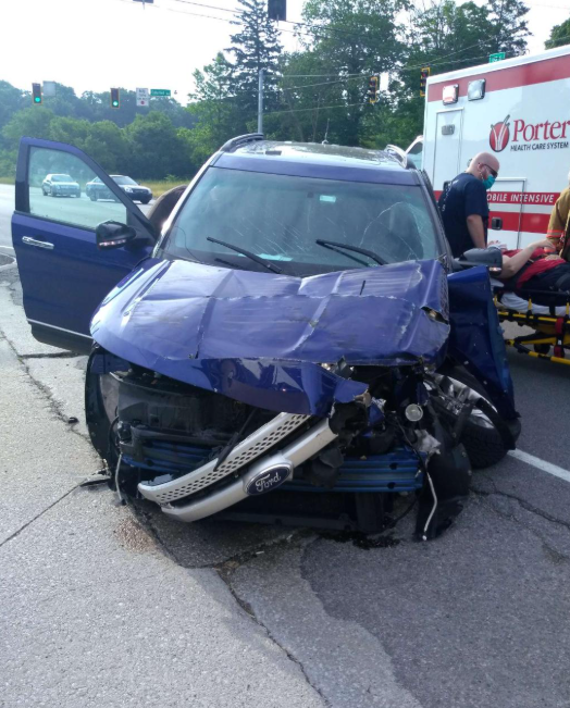 The plaintiff, age 43 and a radiology technician, suffered a mild brain injury in a red light collision with a trucker. It was a very hard hit and illustrated by the picture.
