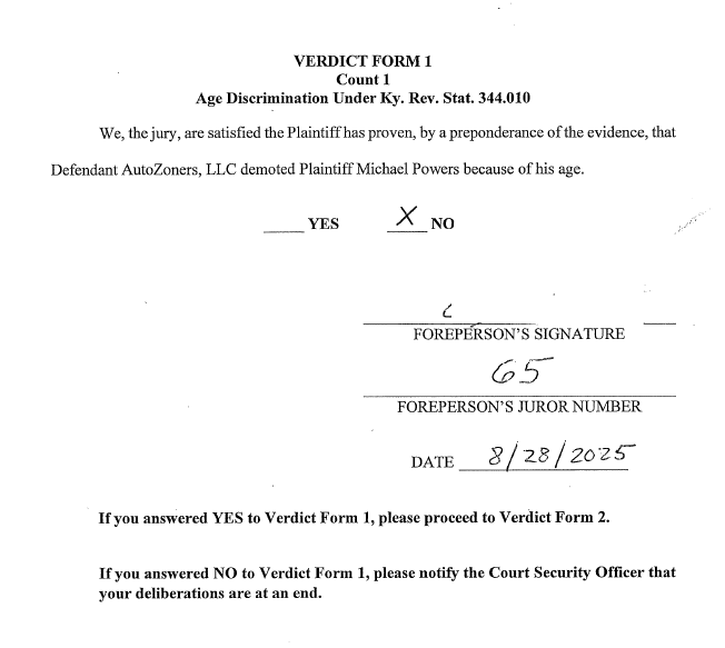 Last week we previewed that an age discrimination case was being tried in Louisville before Judge Jennings. After four days of trial, the verdict was for Auto Zone and plaintiff took nothing. The verdict form is below.
