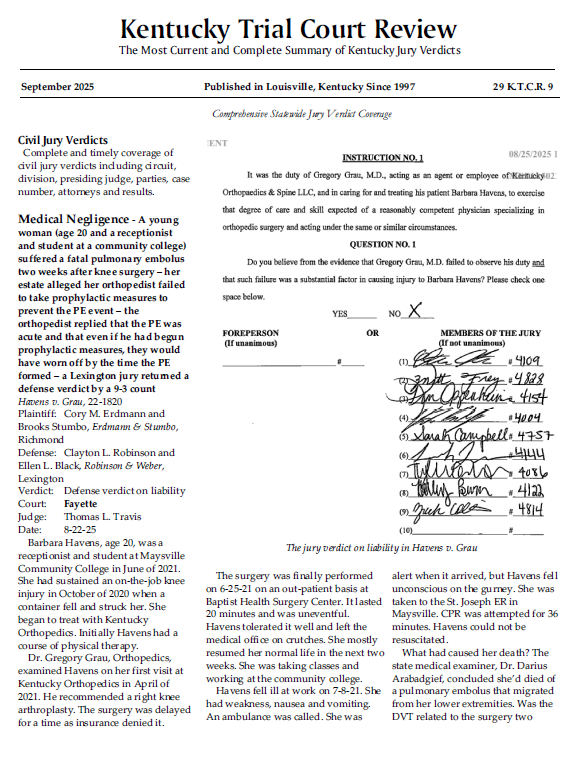 They both resulted in a defense verdict. The Fayette County case (Havens v. Grau) was 9-3 for the defendant orthopedist. Martin v. Dripchak in Louisville was also a defense verdict. I haven't seen the verdict form on that one yet.