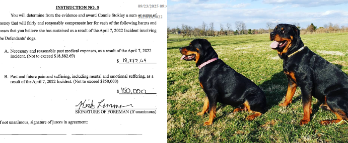 The plaintiff was walking her dogs on a neighborhood street. Suddenly two rottweilers (Apollo and Luna pictured) charged from a house and attacked the plaintiff. They knocked her down and attacked her little dog who was killed in the attack. Her second dog ran away. The plaintiff was also bitten as she protected her dog.