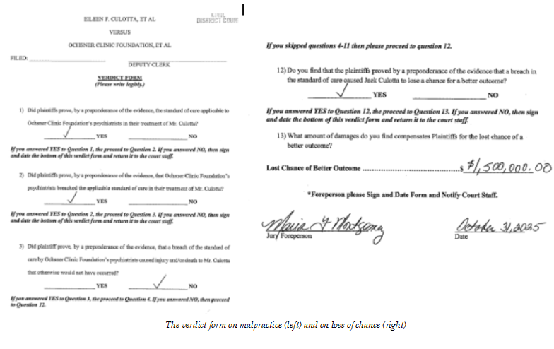 The Culotta plaintiffs (his wife and children) alleged Ochsner psychiatrists mismanaged his medications, failed to communicate, discharged him too soon and discharged him without a proper treatment plan in place. The hospital replied that Culotta was stable at the time of discharge and they met the standard of care.