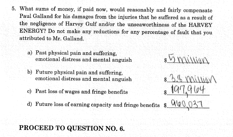 This Wednesday (federal court before Judge Vitter), the jury found Harvey Gulf 95% at fault. It assessed the other 5% to the plaintiff. The damages were $9.958 million including $5,000,000 for past suffering and $3.5 million more for in the future. The net verdict was $9.46 million.