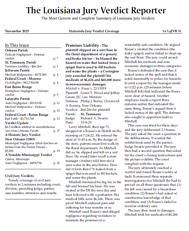 Subscribe to the Louisiana Jury Verdict Reporter for the full report. We've been publishing statewide since 2011.