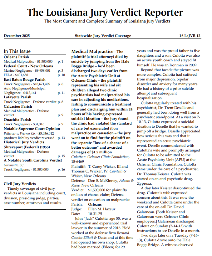 Subscribe to the Louisiana Jury Verdict Reporter. Use the code December2025 at check-out in the online store to save 25%.