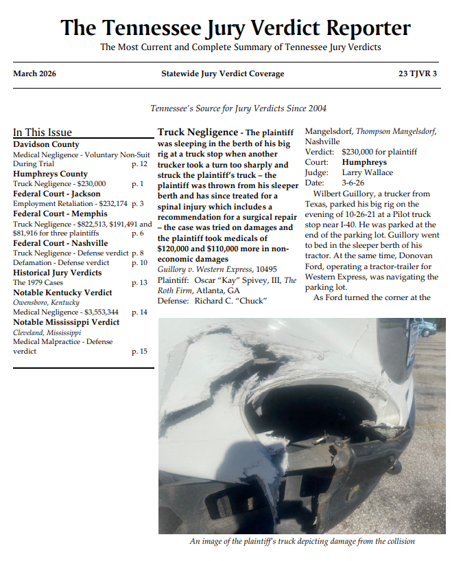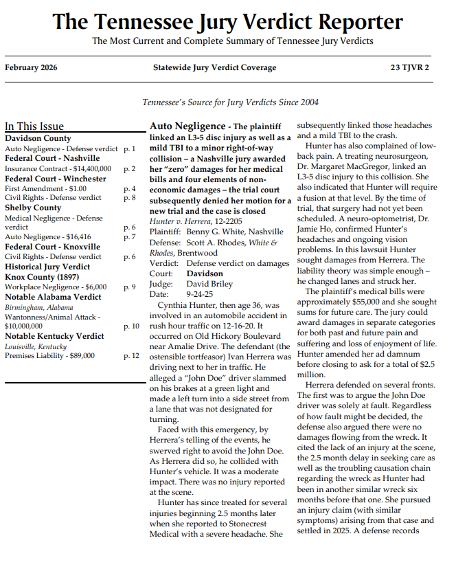 Here are some recent (and not so recent) sample editions of the Tennessee Jury Verdict Reporter (PDF):