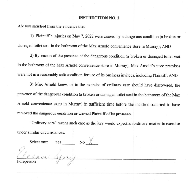 This case was tried for two days last week in Murray before Judge Andrea Moore. The plaintiff had used the toilet at a convenience store and when he stood up, the toilet seat broke which caused him to fall. He later had a C4-6 fusion surgery.